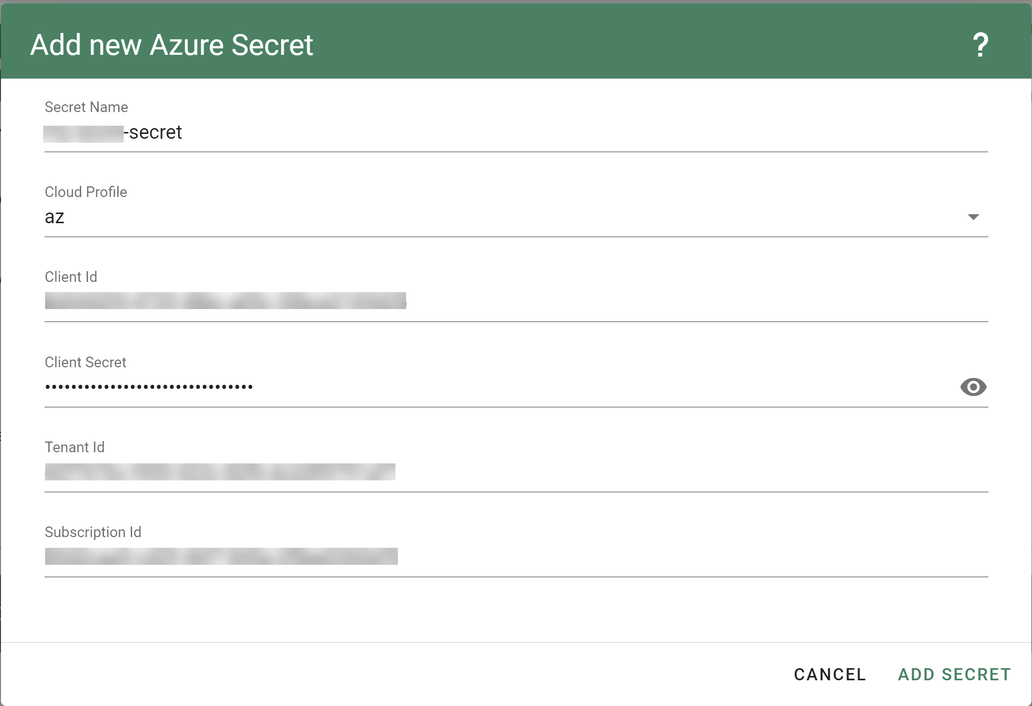 TenantID,SubscriptionIDand the Service Principal credentials (ClientIDandClientSecret). - Choose Add secret.