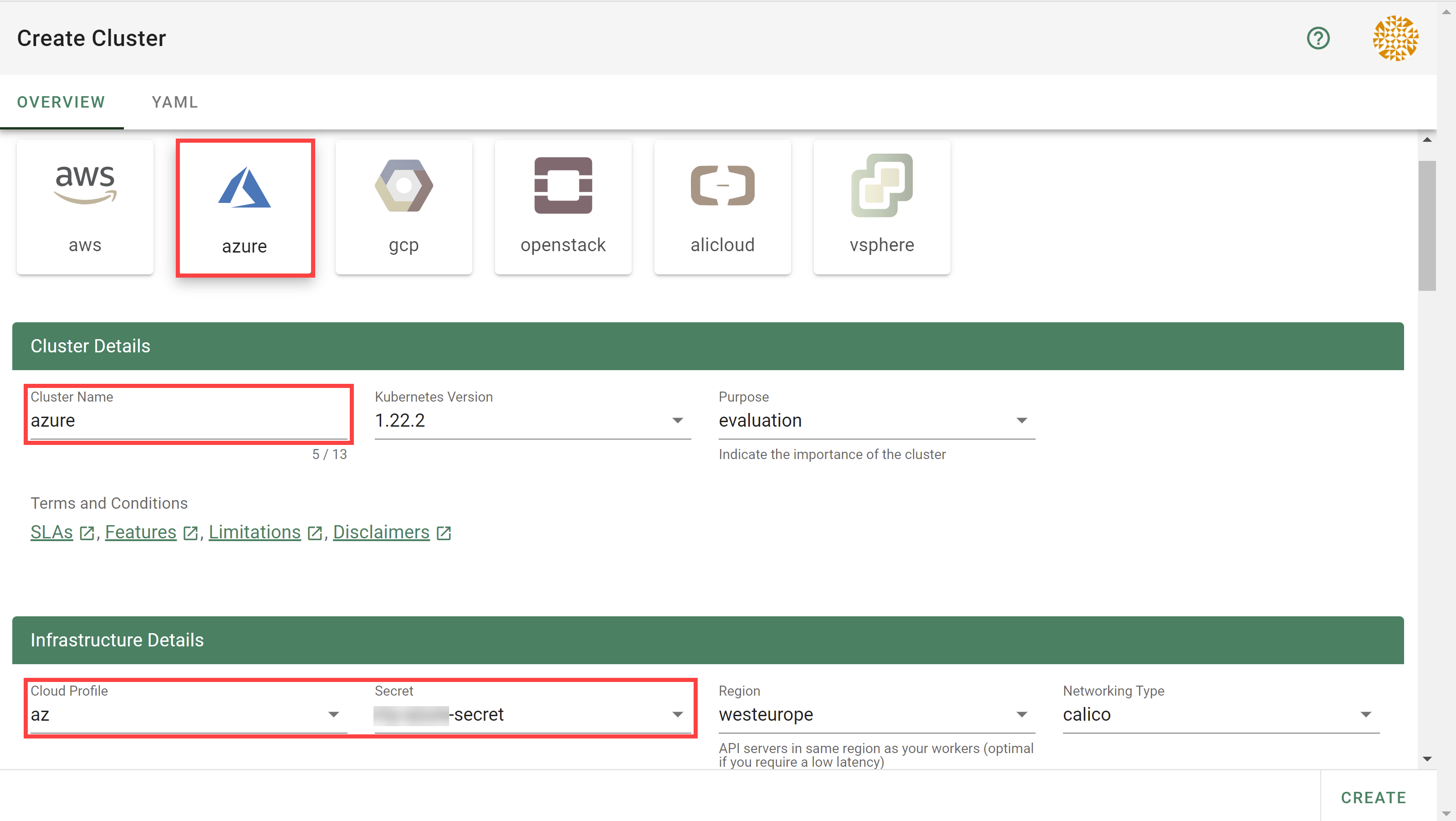 - Choose the secret you created before in the Infrastructure Details tab.