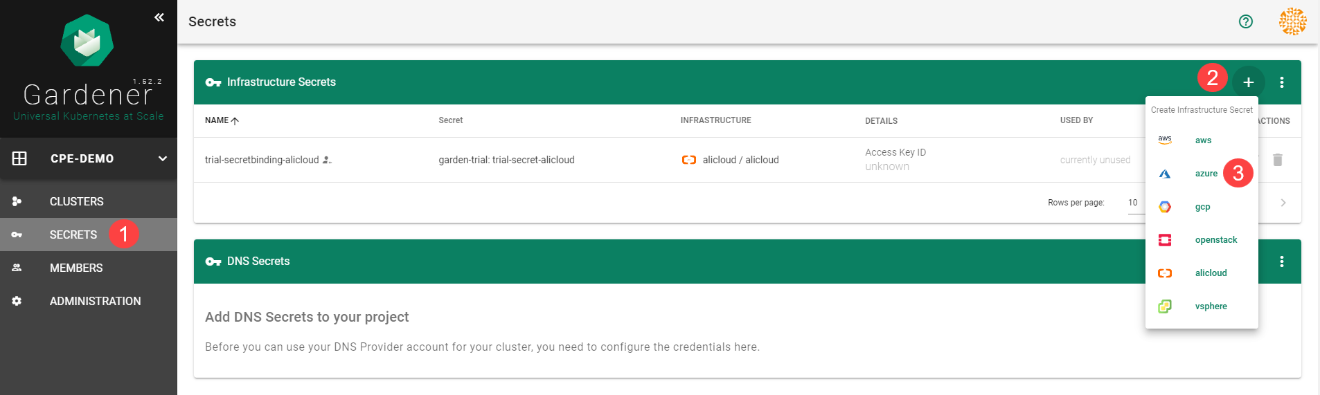 Go to the Gardener dashboard and create a Project.
